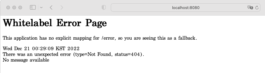 Spring Boot 애플리케이션이 실행되면 웹 브라우저에서 http://localhost:8080 또는 프로젝트에서 설정한 포트로 애플리케이션에 접속하여 확인합니다.