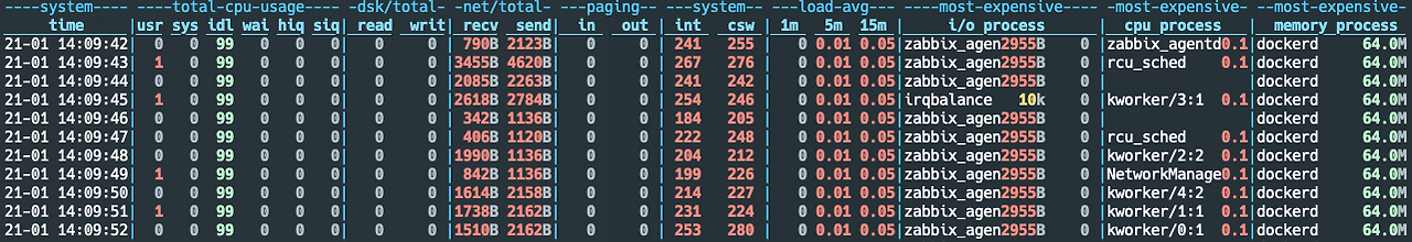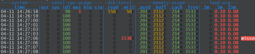 위의 명령어를 실행하면 시간, CPU 사용률, 디스크 I/O, 메모리 사용량 및 로드에 대한 정보가 실시간으로 표시됩니다. 이를 통해 시스템의 성능 및 리소스 사용 상태를 모니터링할 수 있습니다.