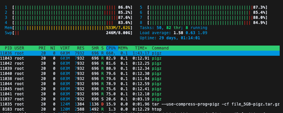 tar --use-compress-prog=pigz -cf file_5GB-pigz.tar.gz file_5GB