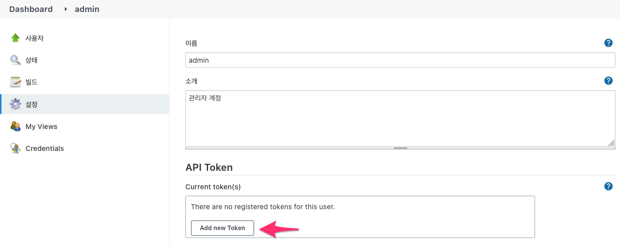 Dashboard > Jenkins 관리 > Manage Users > 사용자[admin] > 설정 > API Token > Add new Token > Generate