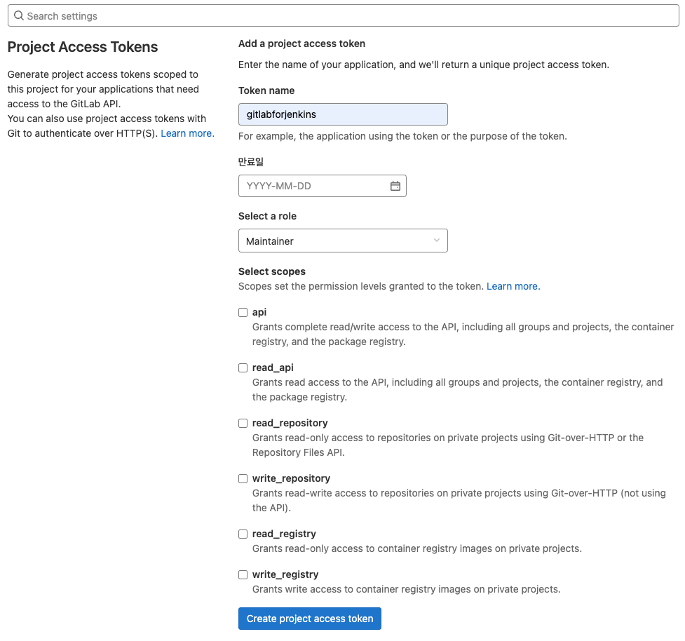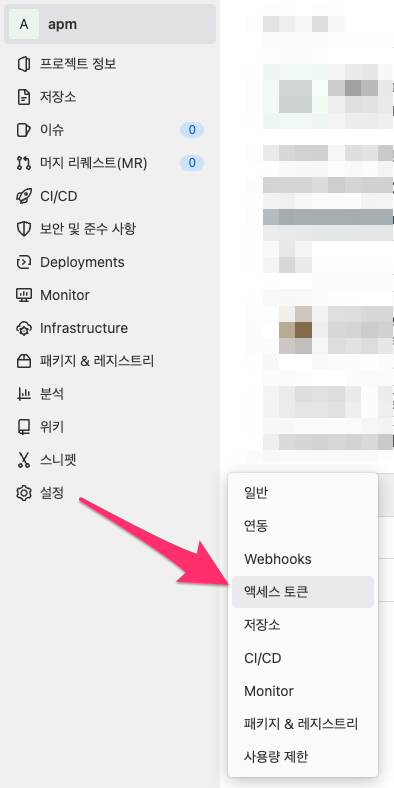 프로젝트 > 설정 > 액세스 토큰 > 개인 액세스 토큰 (or 프로필 > 환경설정 > 액세스 토큰 > 개인 액세스 토큰)