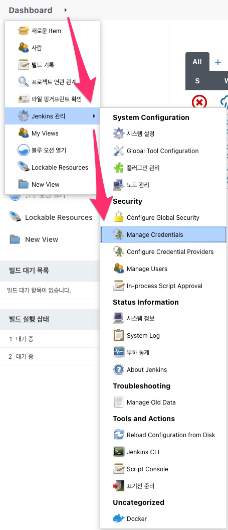 Dashboard > Jenkins 관리 > System Configuration > Manage Credentials