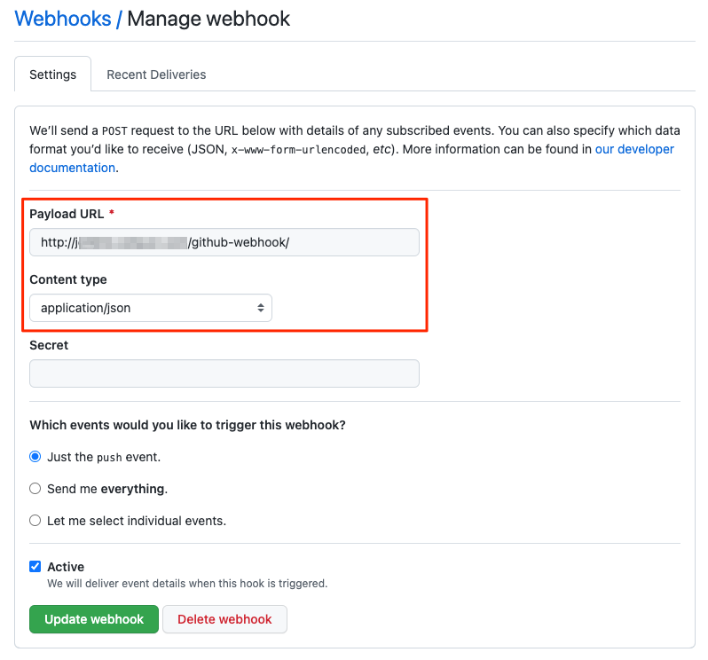- Payload URL : http://{jenkins server url}:8080/github-webhook/