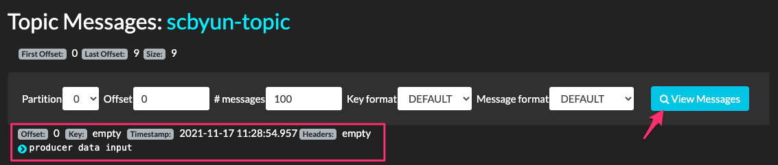 Kafdrop을 통해 웹 브라우저에서 메세지 내용을 확인할 수 있다.
