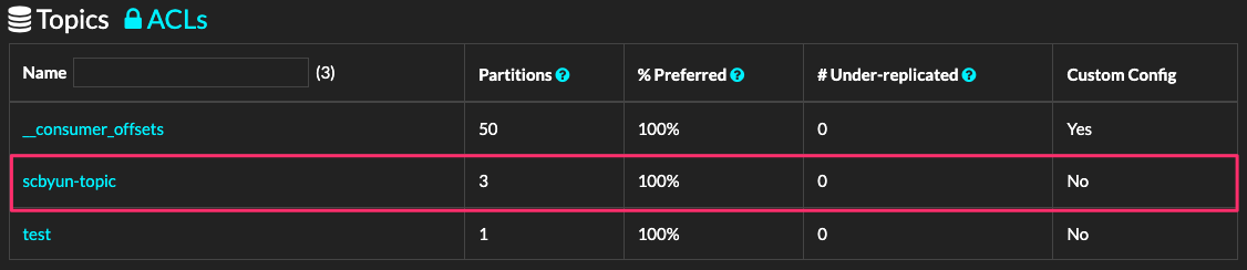 Topic: scbyun-topic TopicId: jqqkyhYCSWyeVK61NUKL-Q PartitionCount: 1 ReplicationFactor: 1 Configs: