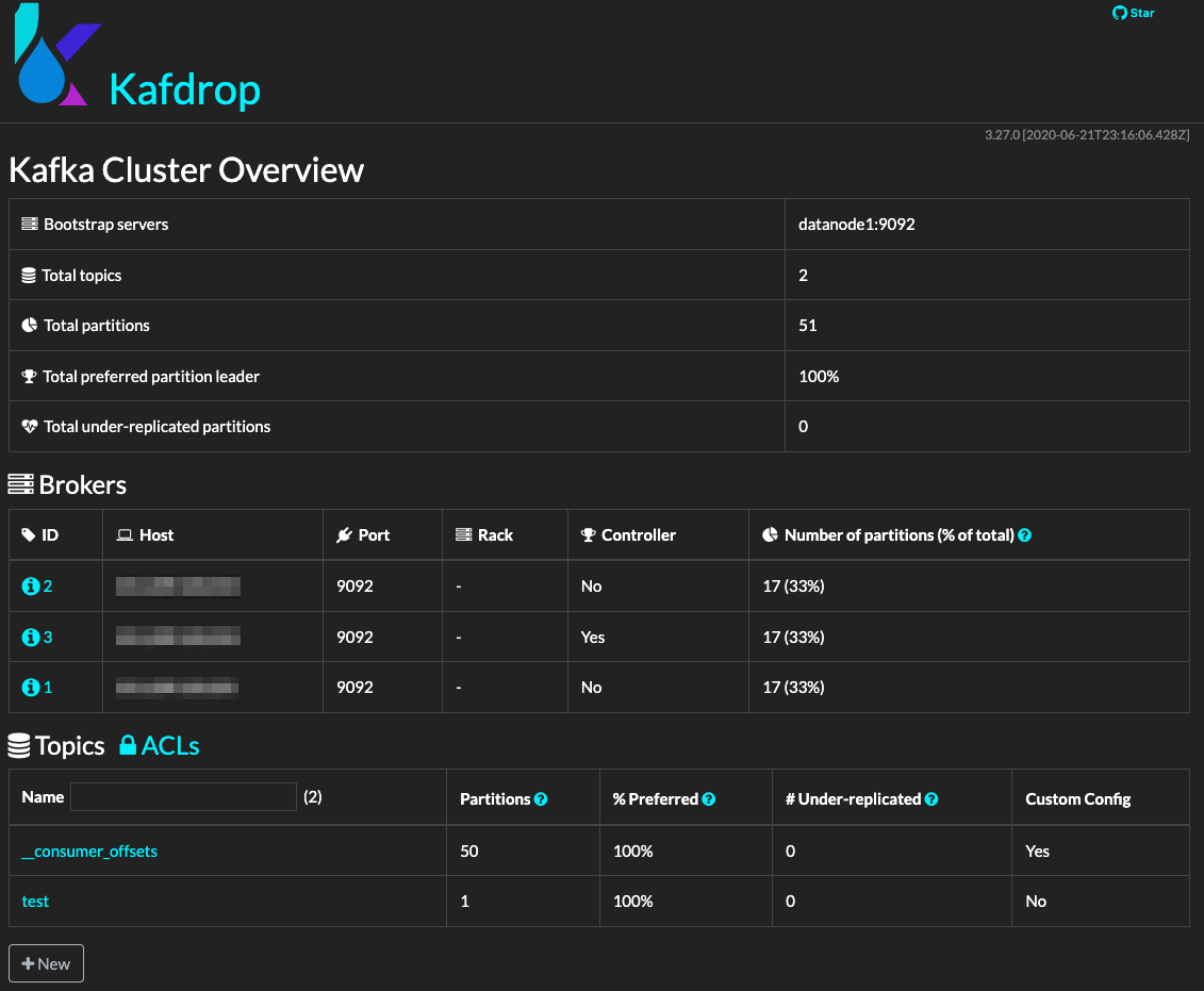 Kafdrop은 Kafka 주제를 보고 소비자 그룹을 탐색하기 위한 웹 UI입니다. 이 도구는 브로커, 주제, 파티션, 소비자와 같은 정보를 표시하고 메시지를 볼 수 있도록 합니다