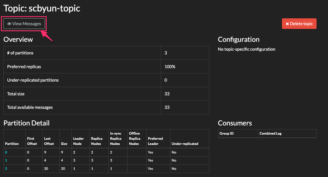 Topic: scbyun-topic TopicId: jqqkyhYCSWyeVK61NUKL-Q PartitionCount: 1 ReplicationFactor: 1 Configs: