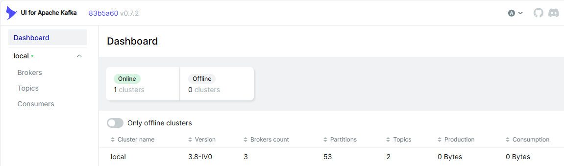 대시보드 : Kafka-UI에 접근하면 Kafka 클러스터 목록을 보여주는 대시보드가 표시됩니다.