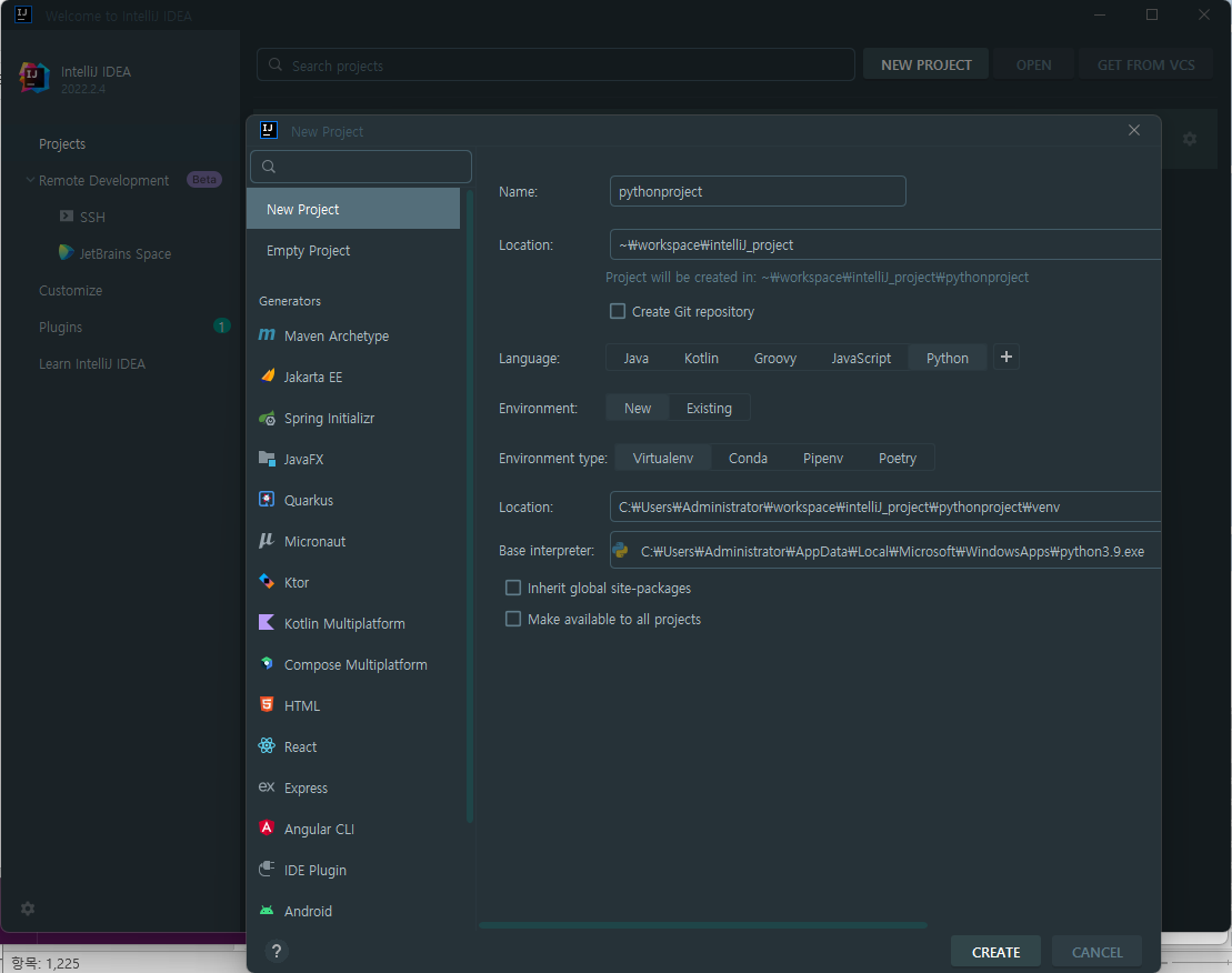 Intellij로 python 프로젝트 생성