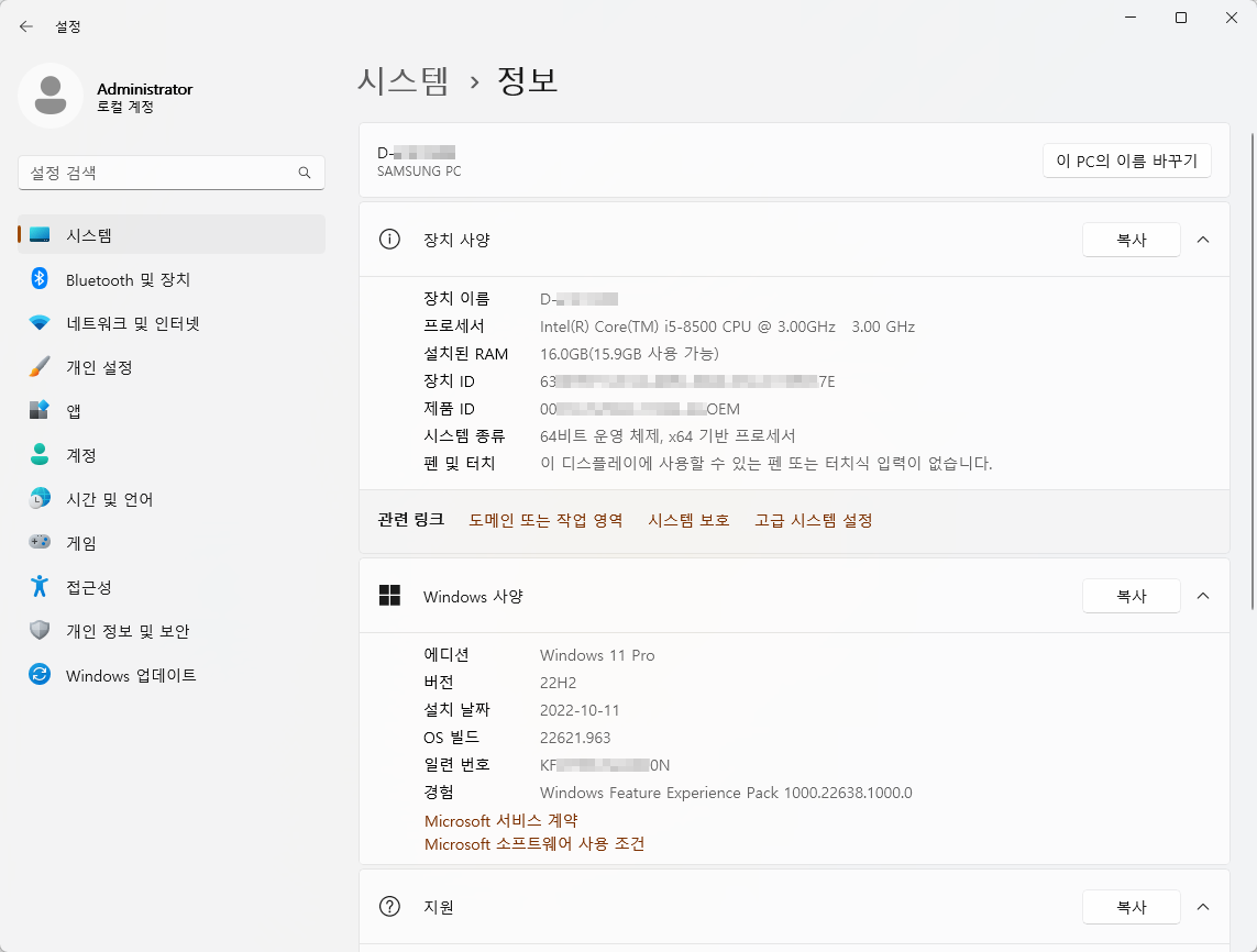 2) 시작 > 설정 > 시스템 > 정보