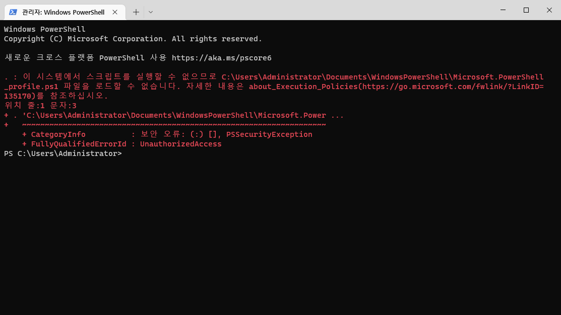 PowerShell "Microsoft.PowerShell_profile.ps1 파일을 로드할 수 없습니다." 오류