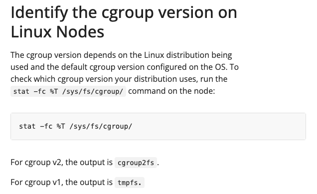 - kubernetes docs : Identify the cgroup version on Linux Nodes