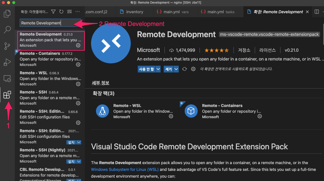 1. vscode > Extensions Marketplace > Remote Development > 설치
