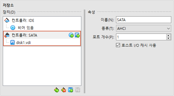 - 기본적으로 IDE 컨트롤러를 사용하면 성능이 낮을 수 있으므로 SATA 컨트롤러로 변경합니다.