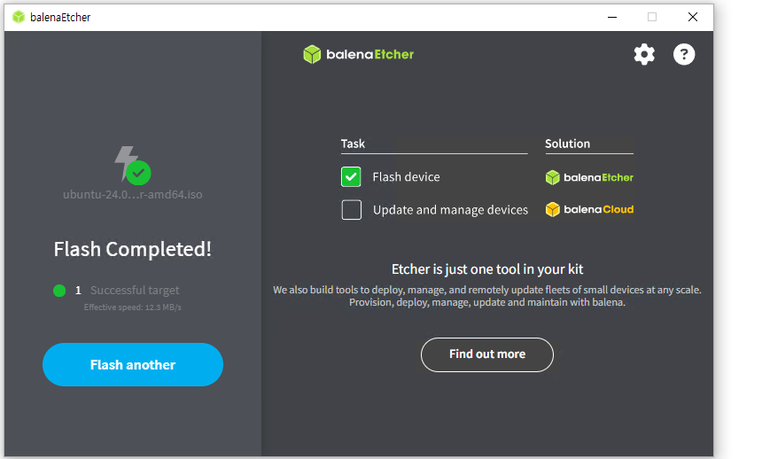 - 이미지 쓰기가 완료되면 "Flash Complete!" 메시지가 표시됩니다.