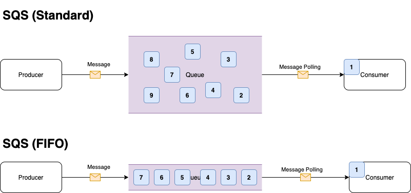 SQS는 크게 Standard Queue와 FIFO Queue 두 가지 종류가 있습니다. Standard Queue는 메시지의 순서가 보장되지 않으며, 메시지 전달이 최소한 한 번 이상 보장됩니다. FIFO Queue는 메시지의 순서와 메시지 전달이 정확히 한 번 보장됩니다.