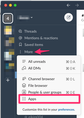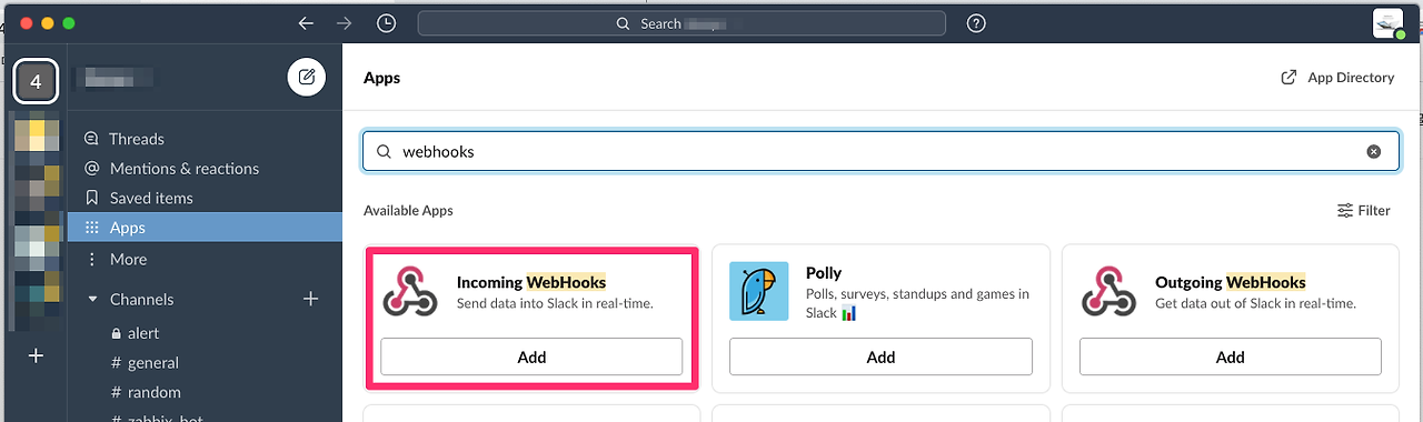 2. workspaces > Apps > 검색 창에서 "webhooks" 검색