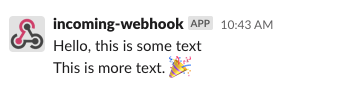 curl -i -X POST -H 'Content-Type: application/json' -d '{"text": "Hello, this is some text\nThis is more text. :tada:"}' "webhookURL"