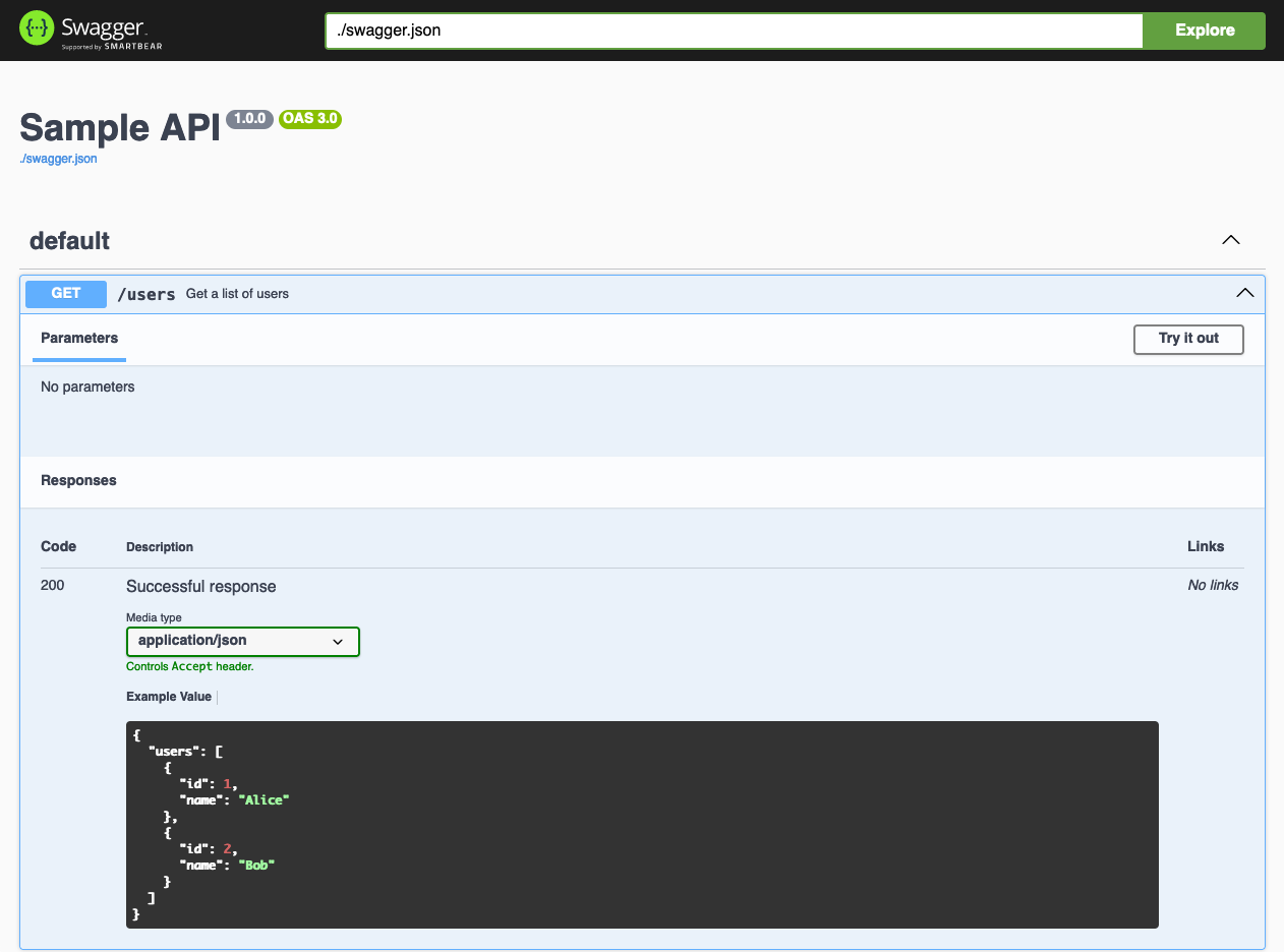 Swagger UI는 OpenAPI Specification(JSON 또는 YAML) 파일을 기반으로 API 문서를 시각화합니다.
