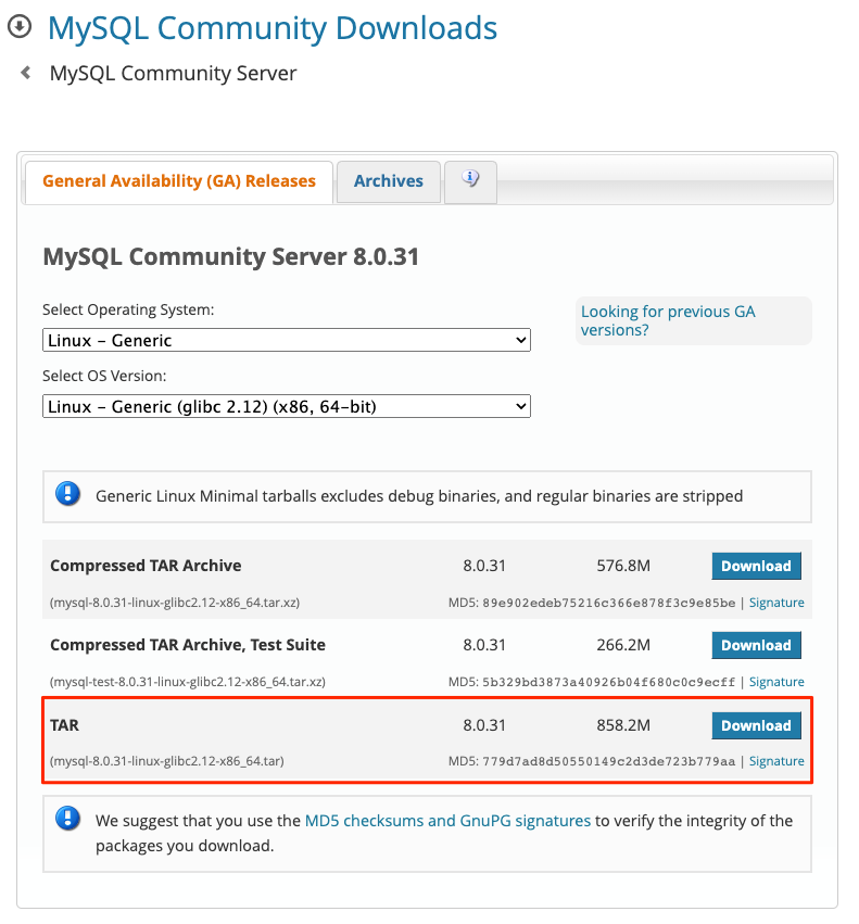 wget -q https://dev.mysql.com/get/Downloads/MySQL-8.0/mysql-8.0.31-linux-glibc2.12-x86_64.tar