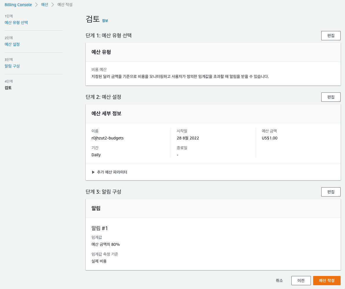 설정한 Budget과 알람 설정을 확인하고 필요한 경우 수정합니다.