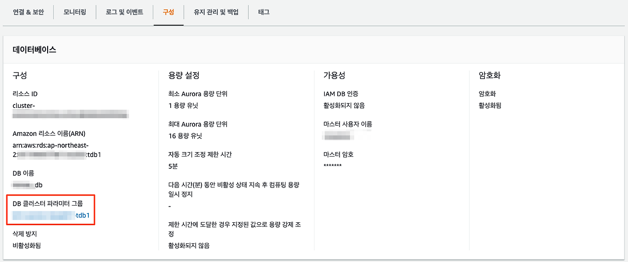 - DB 클러스터 파라미터 그룹 이름 : (tdb1)