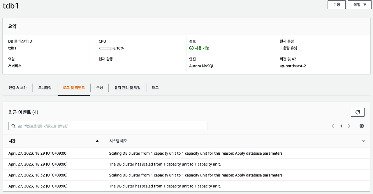 Amazon RDS > 대시보드 > DB 클러스터 > DB 식별자(tdb1) > 로그 및 이벤트