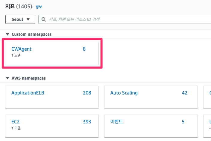 - CloudWatch > 지표 > 모든 지표 > Custom namespaces