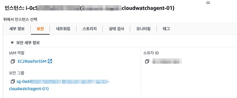 - IAM > 액세스 관리 > 정책 > 기존 역할 > 권한 추가 > 정책 연결 > CloudWatchAgentServerPolicy, AmazonSSMFullAccess