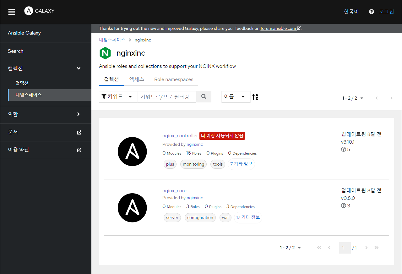 - 전 세계 Ansible 사용자들이 공유하는 Role / Collection 저장소