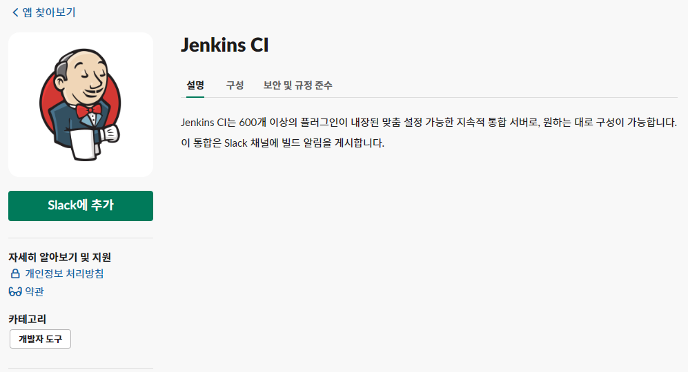 Slack 앱 관리 페이지로 이동하여 "Jenkins CI" 앱을 검색하고 추가합니다.