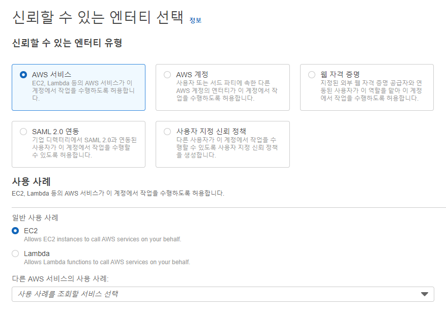 Identity and Access Management(IAM) > 액세스 관리 > 역할 > 역할 만들기