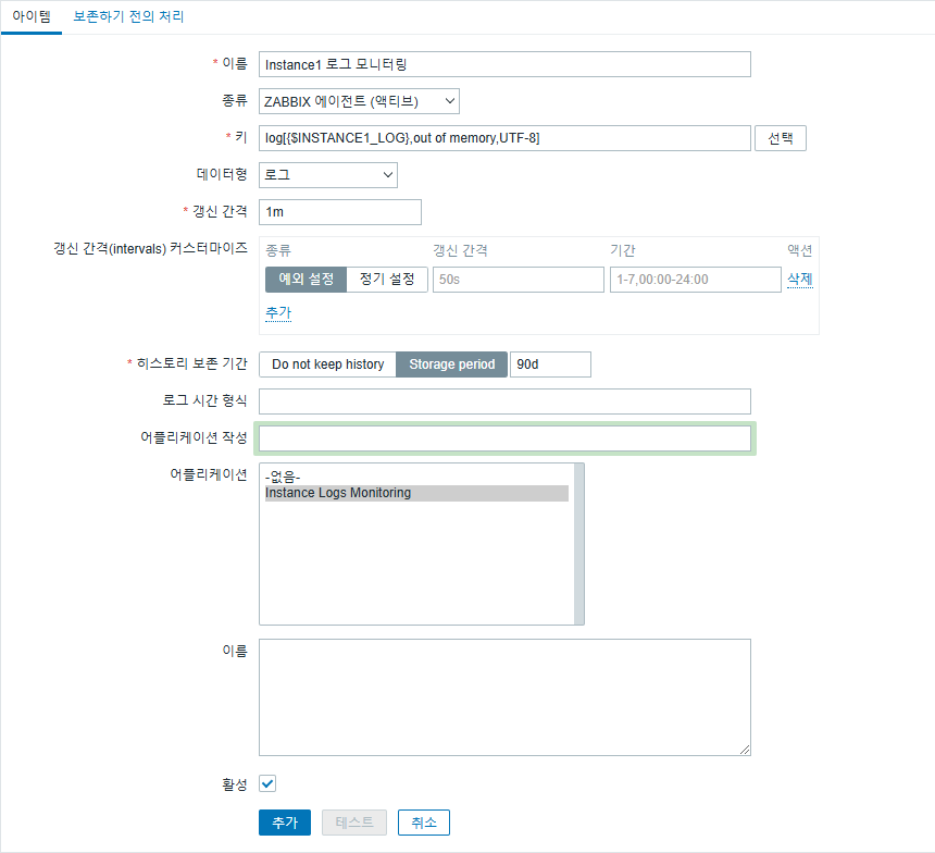 - 키 : log[{$INSTANCE1_LOG},out of memory,UTF-8]