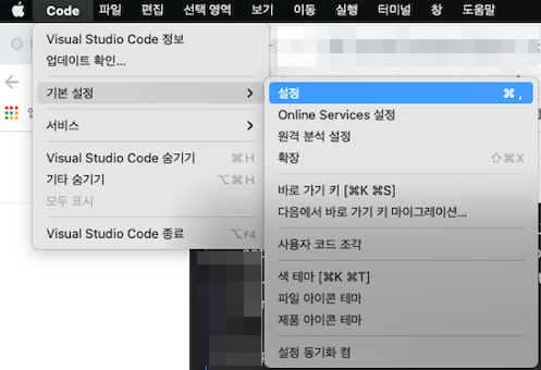 Code > 기본 설정 > 설정 또는 Command + ,